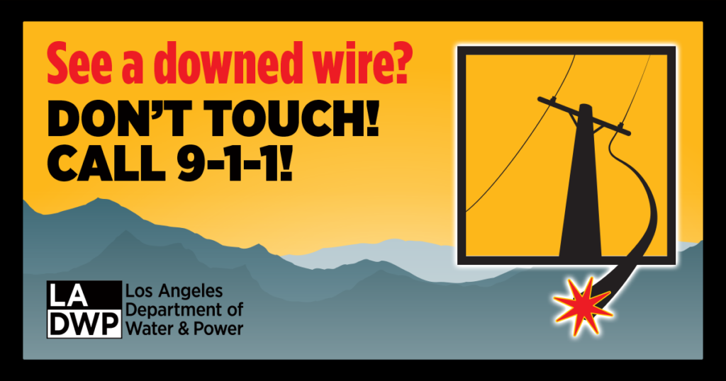 LADWP reminds customers to use caution around any downed or dangling wires or poles. If you see a downed wire, always assume it is live. Do not assume a downed wire is a communication line. Never approach or touch any wire that is down or dangling, immediately report it by calling 9-1-1.